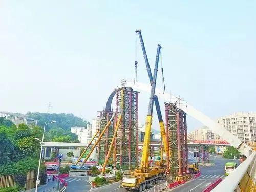 吊装施工需占用道路,得到了交警部门的大力支持,早在国庆节前,交警部门就提前发布道路交通限制的公告。拱肋分为四节吊装,施工从10月2日凌晨开始,在多台大型起重机的密切配合下,四节拱肋成功吊装至指定位置,并焊接加固。整个吊装过程交通组织有序,支架监测稳定,质量安全可控。