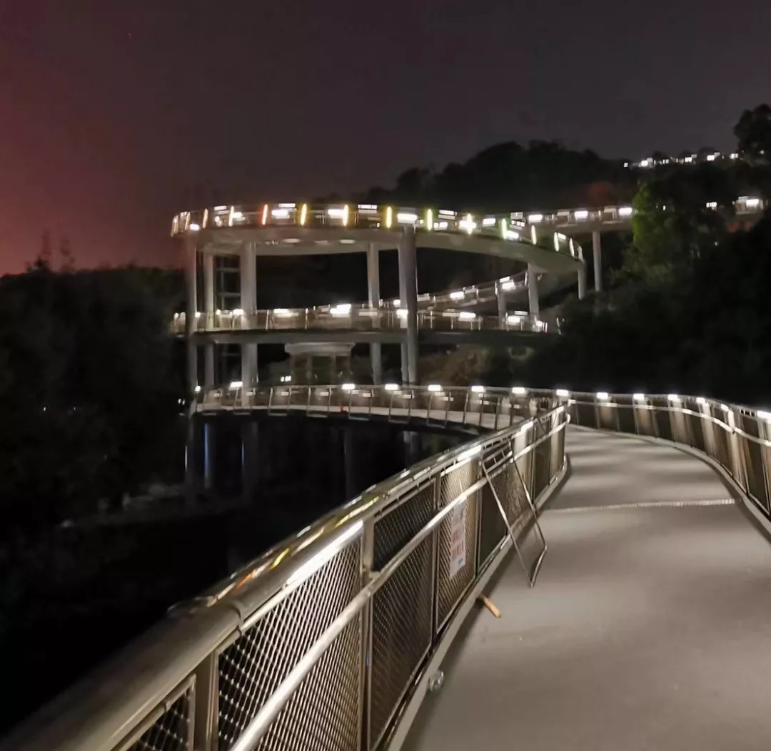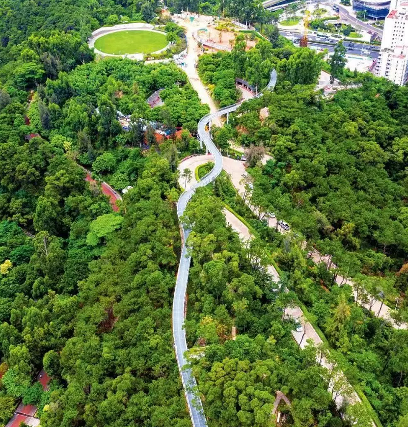 步道依地形采用桥梁与地面相结合的形式,跨越市政道路和山谷设置七座造型独特的大跨度桥梁,沿线配备观景平台、节点公园、驿站等服务设施。