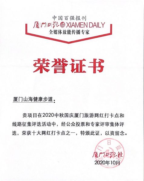 由厦门日报社联合厦门市文化和旅游局推出的“2020中秋国庆厦门旅游网红打卡点和线路征集评选”,经公众投票和专家评审集体评选,厦门山海健康步道荣获十大网红打卡点之一!